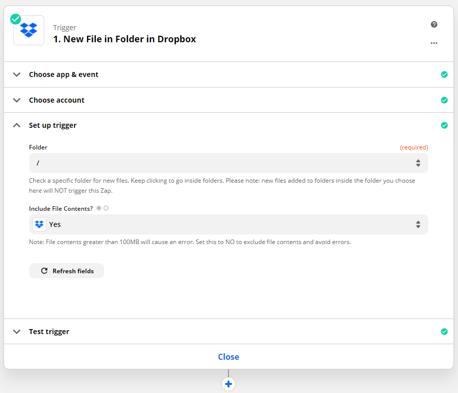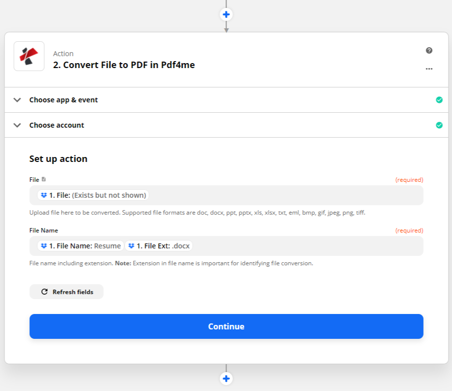 O PDF4me atualmente não suporta nenhum gatilho. Portanto, você pode precisar usar outro aplicativo apropriado para acionar seu zap. Como caso de teste, você pode usar o Dropbox com o novo gatilho de arquivo.