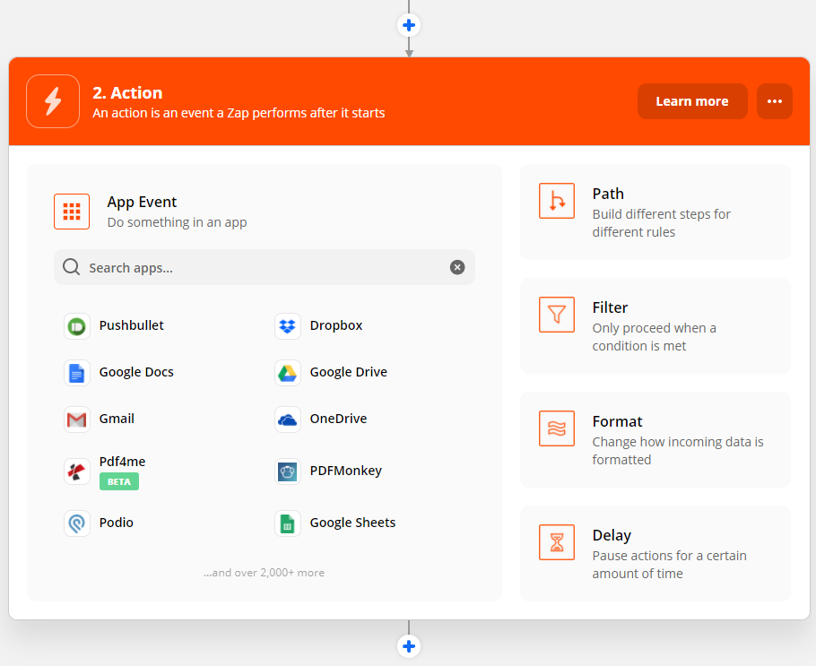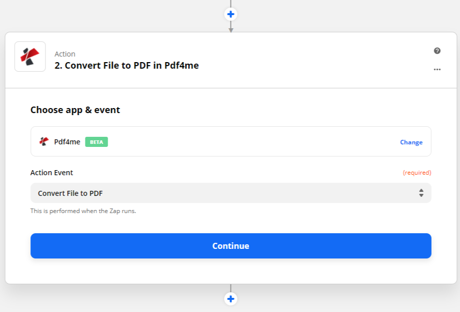 O segundo passo para criar um zap é ‘Ação’. Escolha Pdf4me da lista de aplicativos exibidos. Além disso, escolha também a ação que deseja realizar.