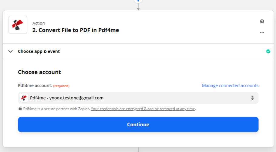 Após a seleção do evento, a aplicação Pdf4me precisa verificar o usuário. Após a verificação, você pode usar os campos relevantes dos passos anteriores para passá-los para a ação Pdf4me.
